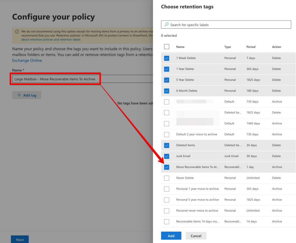 4. Create a new retention policy and add the above retention tag (plus any other retention tags you want):